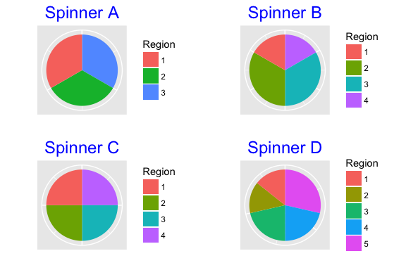 sp4 <- c(2, 2, 3, 3, 4)many_spinner_plots to display all of the spinners.many_spinner_plots(list(sp1, sp2, sp3, sp4))