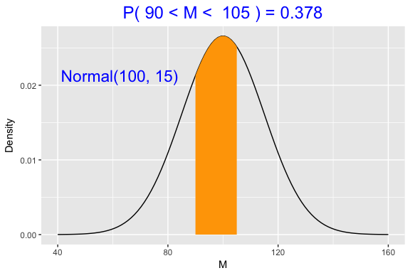 normal_area displays and computes a normal probability.normal_area(90, 105, c(100, 15))
