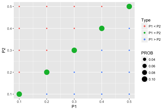 two_p_update will update a 2-proportion discrete prior with data.prior <- testing_prior(.1, .5, 5)