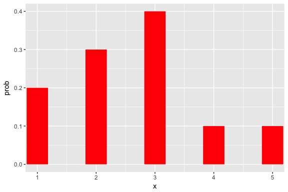 prob_plot constructs a plot of a discrete probability distributionprob_plot(data.frame(x=1:5, prob=c(.2, .3, .4, .1, .1)))