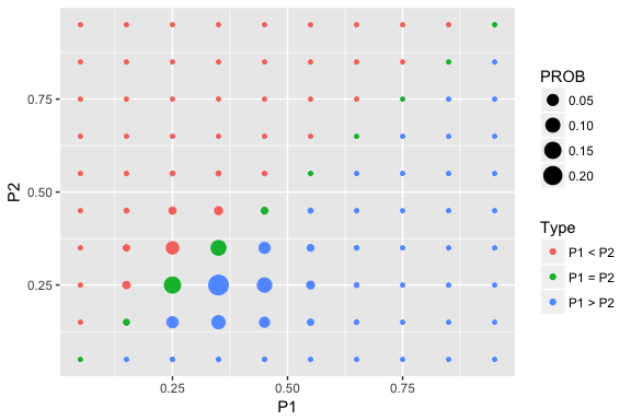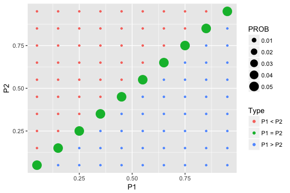 library(TeachBayes)Start with a uniform prior on (p1, p2), where each proportion takes on values .05, .15, …, .95.