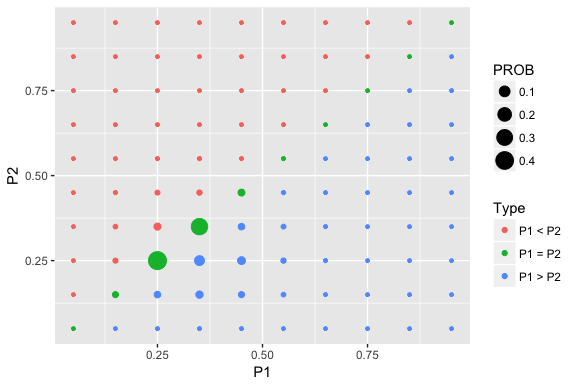 post <- two_p_update(prior, y1n1, y2n2)Graph and summarize: