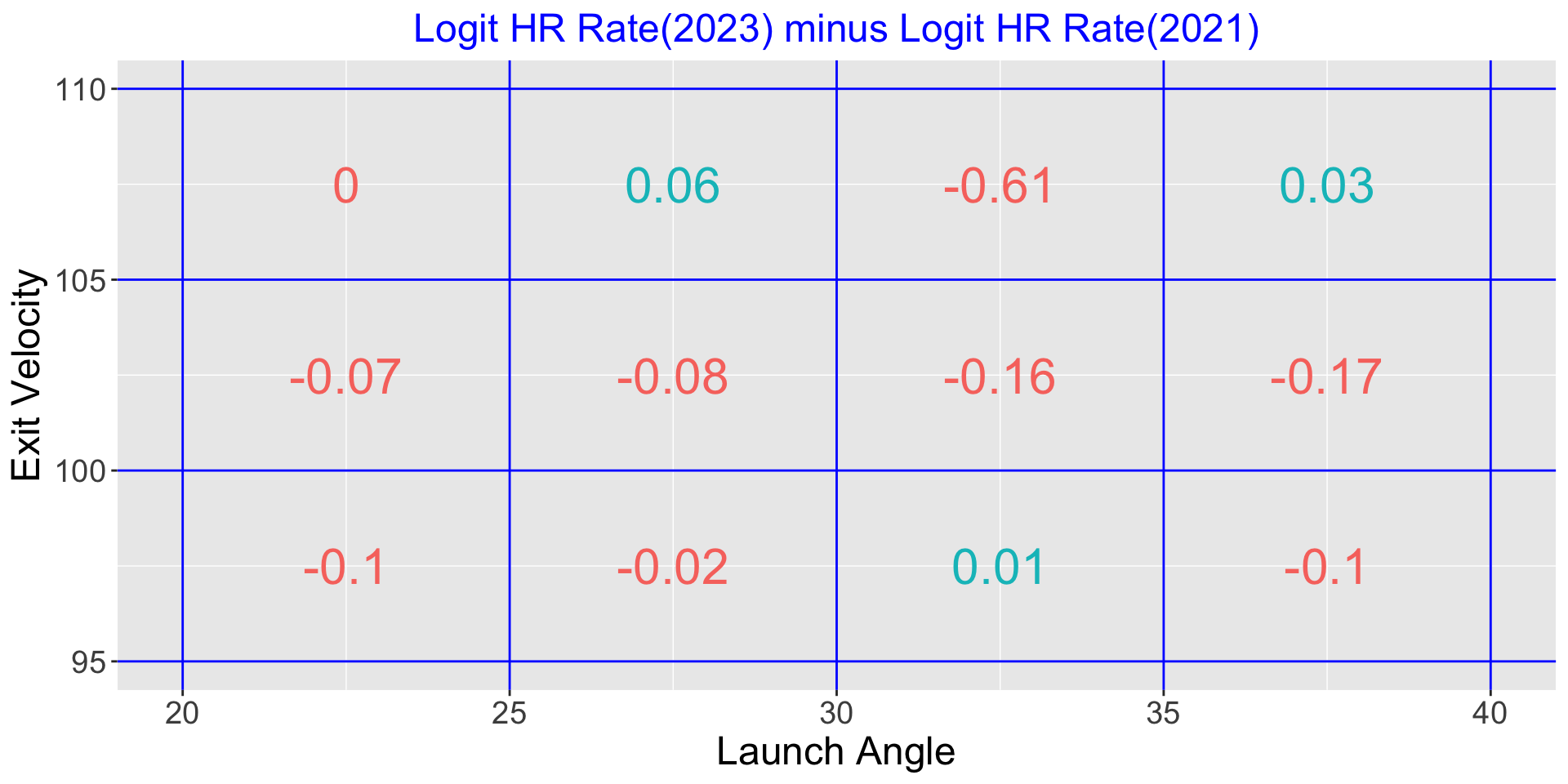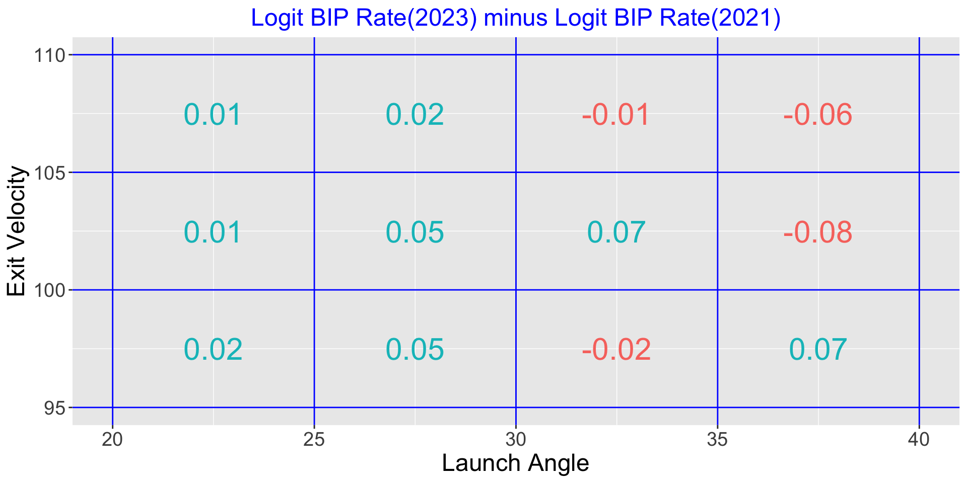 Some increase in batted ball rates in 2023 (compared with 2021) for high exit velocities and launch angles smaller than 30 degrees.