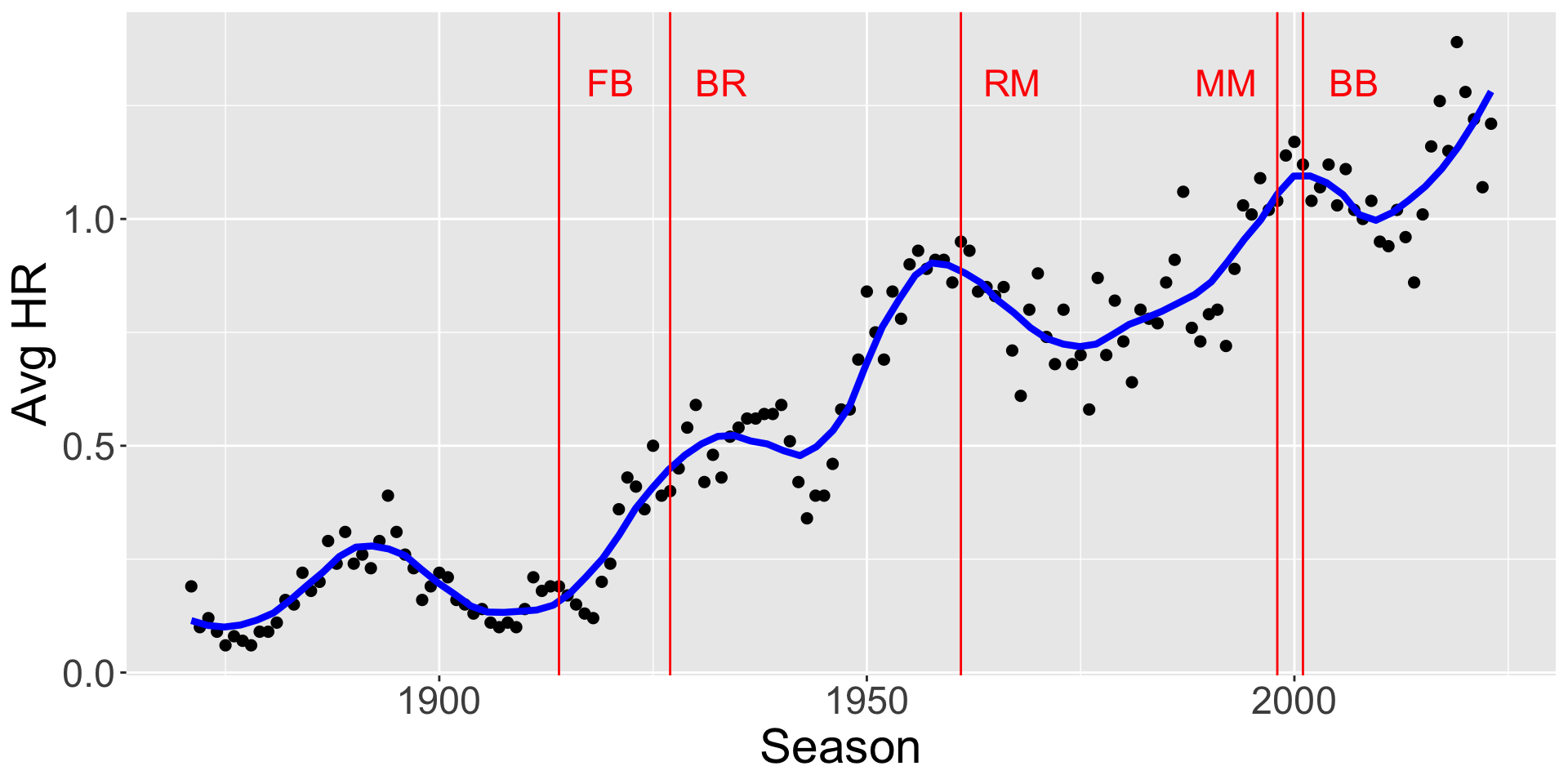 Define the home run rate as the fraction of \(HR\) among all batted balls (\(AB - SO\))\[ HR \, Rate = \frac{HR}{AB - SO} \]