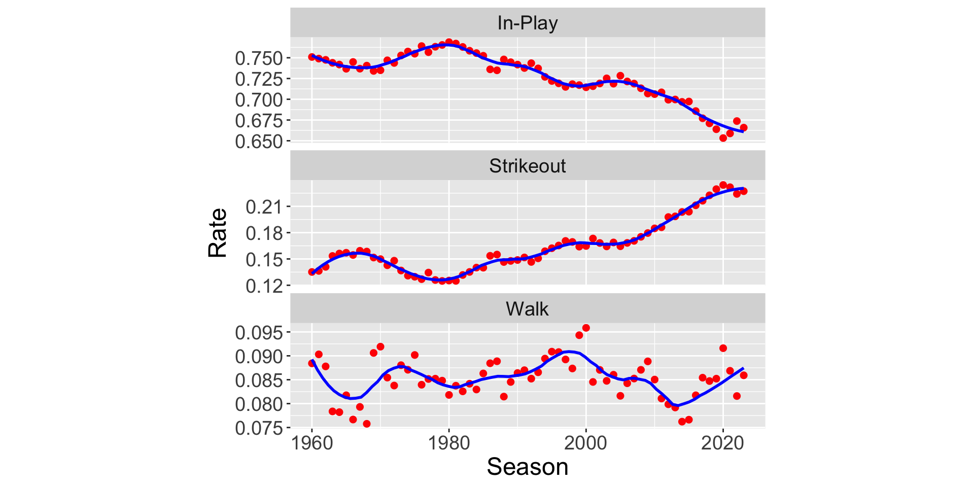 How have the rates of these three outcomes changed over the last 50 years of baseball?